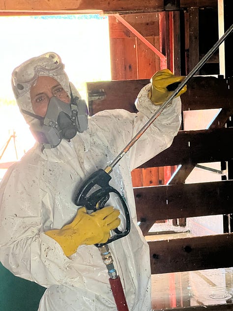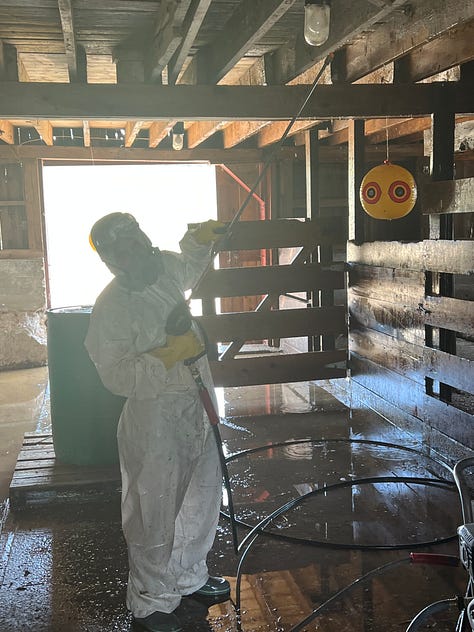 Once a dairy barn, ours was converted with stalls for horses. She had been used most recently for storage although overrun with rodents, barn swallows, bats, and wasps. In 2023, our crew tried to reclaim the space and began cleaning her out, only to discover the interior stalls were coated with lead paint.